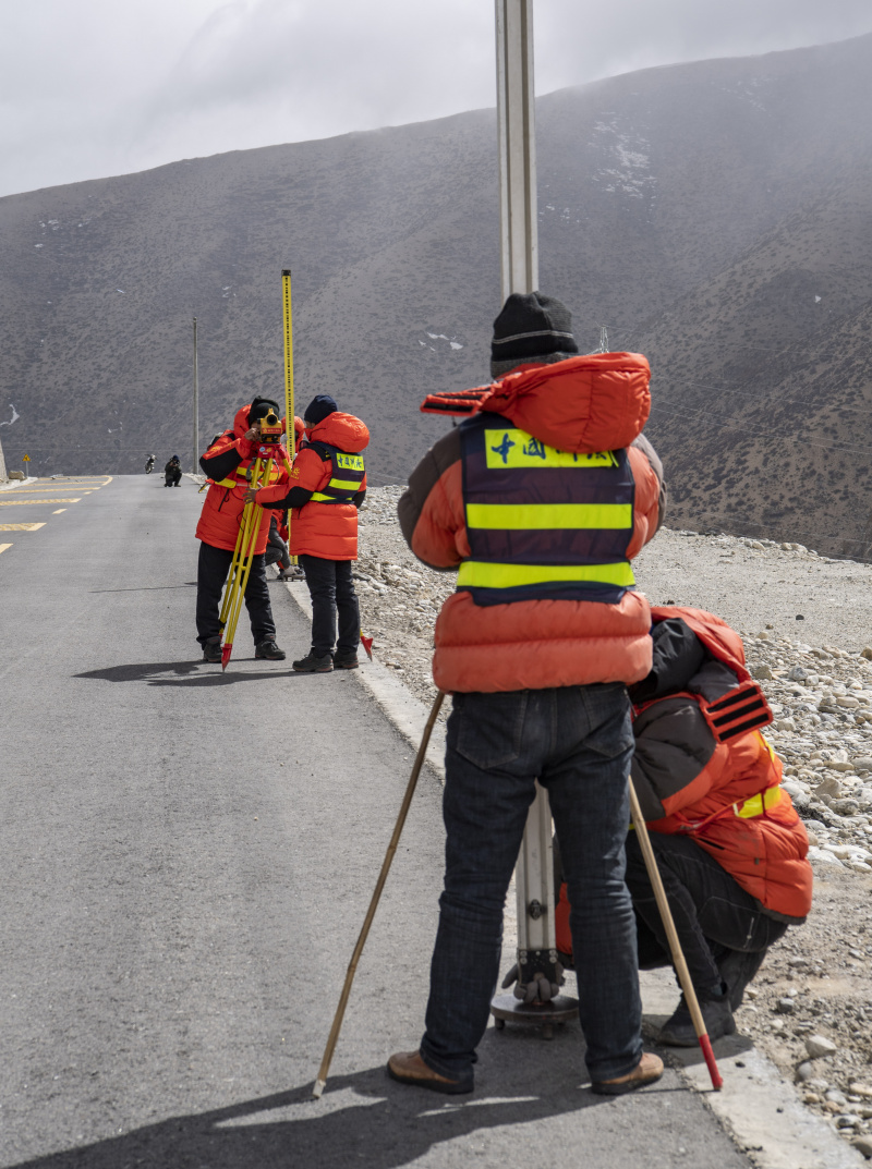 Des membres de l'équipe de mesure procèdent au nivellement dans le district de Tingri de la région autonome du Tibet, dans le sud-ouest de la Chine, le 4 mai 2020