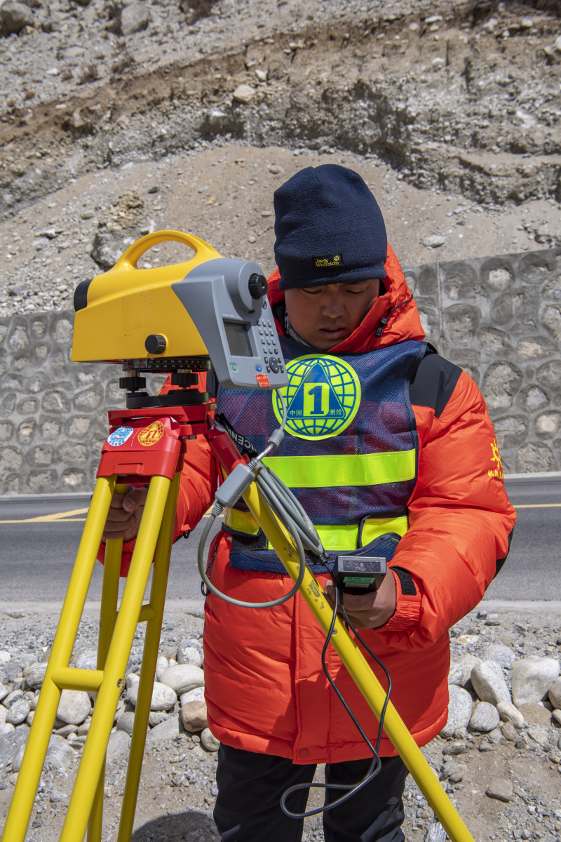Un membre de l'équipe de mesure procède au nivellement dans le district de Tingri de la région autonome du Tibet, dans le sud-ouest de la Chine, le 4 mai 2020