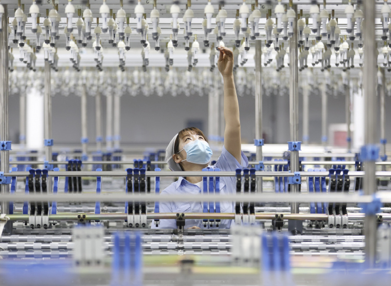 Une ouvrière effectue des réglages sur une machine dans une usine d'un parc industriel de l'arrondissement de Jimo, à Qingdao, dans la province chinoise du Shandong (est), le 15 mai 2023