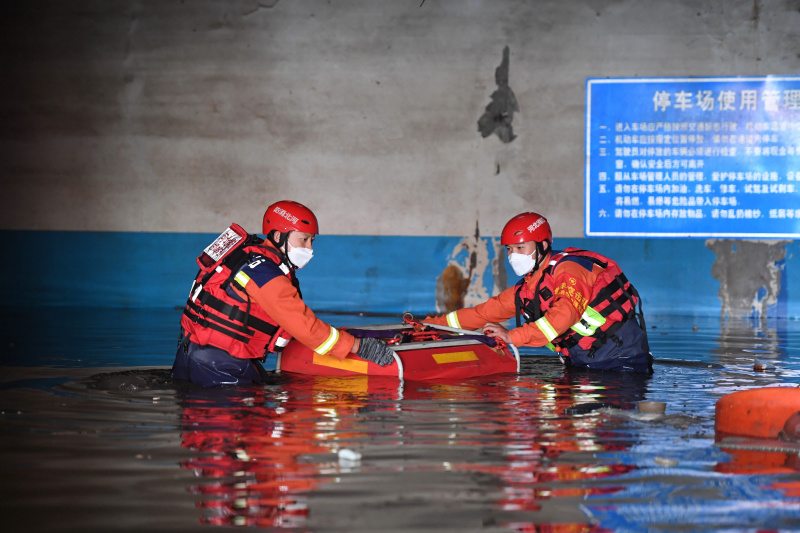 Des secouristes mènent des opérations de drainage dans un parking sous-terrain du centre-ville de Zhuozhou de la province chinoise du Hebei (nord), le 7 août 2023
