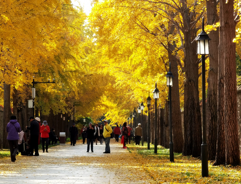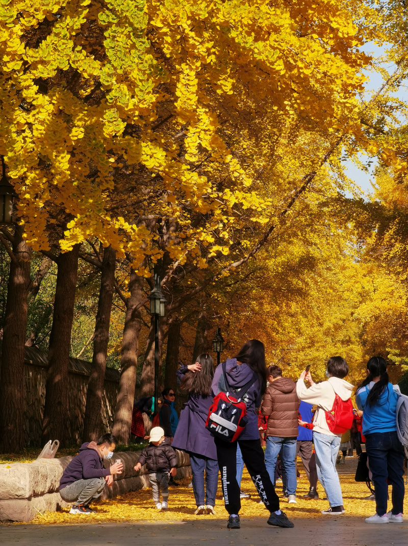 Des touristes prennent des photos sous des ginkgos, dans le parc Yuanmingyuan, ou l'ancien Palais d'été, à Beijing, capitale chinoise, le 4 novembre 2020