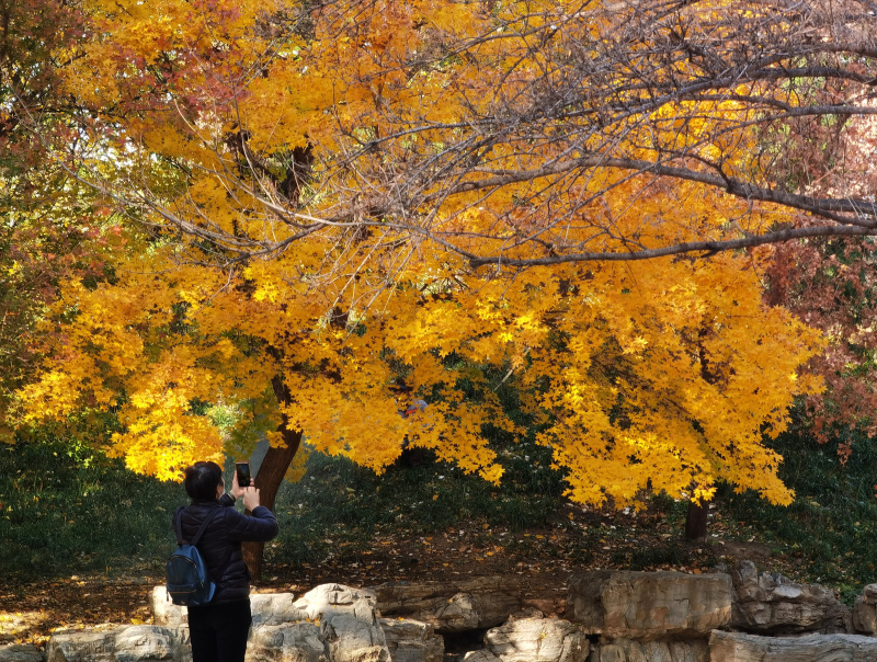 Une touriste prend des photos de ginkgos, dans le parc Yuanmingyuan, ou l'ancien Palais d'été, à Beijing, capitale chinoise, le 4 novembre 2020. - Photo : Luo Xiaogua