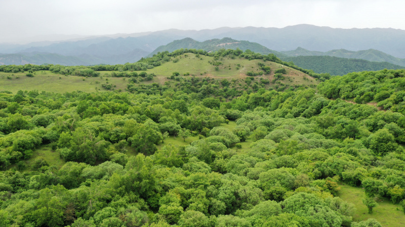 Photo aérienne d'une ferme forestière de la montagne Guanshan dans le district autonome Hui de Zhangjiachuan à Tianshui, dans la province chinoise du Gansu (nord-ouest), le 7 juin 2022