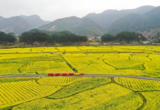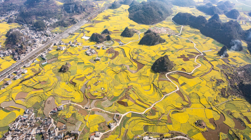 Photo aérienne de champs de fleurs de colza sur un site touristique, dans le district de Guiding, dans la province chinoise du Guizhou (sud-ouest), le 12 mars 2023. - Photo : Yang Wenb