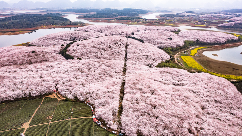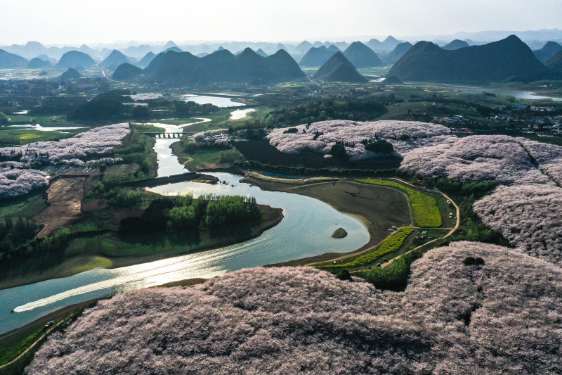 Photo aérienne de cerisiers en floraison dans un jardin de cerisiers dans la nouvelle zone de Guian, dans la province chinoise du Guizhou (sud-ouest), le 21 mars 2023