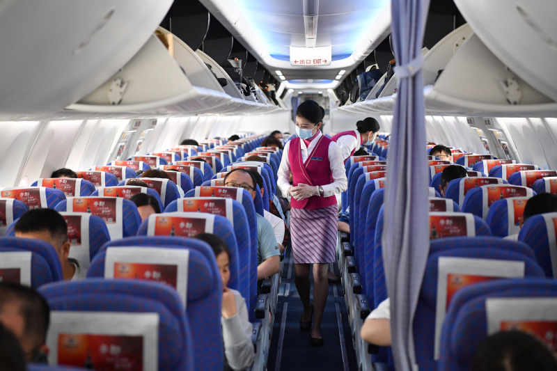 Des hôtesses procèdent à des inspections de sécurité avant le décollage du premier avion de passagers de la ligne Xi'an-Urumqi-Achgabat, à Xi'an, dans la province chinoise du Shaanxi (nord-ouest), le 13 mai 2023