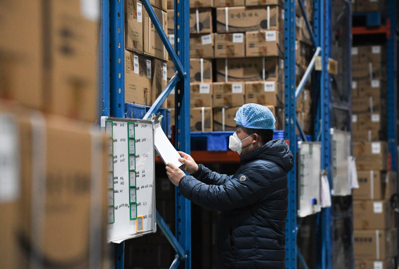Un membre du personnel travaille dans l'entrepôt d'une entreprise pharmaceutique à Xi'an, dans la province chinoise du Shaanxi (nord-ouest), le 19 décembre 2022