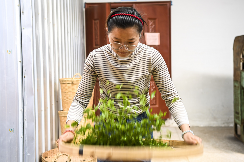 Une agricultrice sélectionne des feuilles de thé fraîchement cueillies dans le village de Pengtang, du district de Xingye, dans la région autonome Zhuang du Guangxi (sud de la Chine), le 19 février 2024