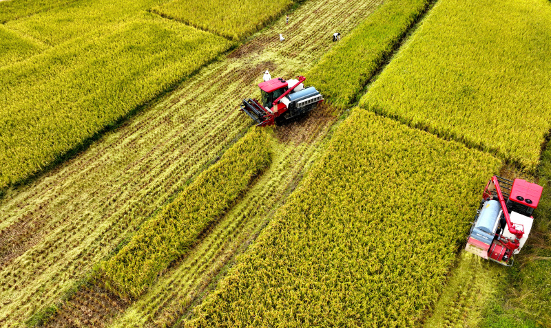 Des villageois dans une rizière du district de Yangxian, à Hanzhong, ville de la province chinoise du Shaanxi (nord-ouest), le 10 septembre 2022