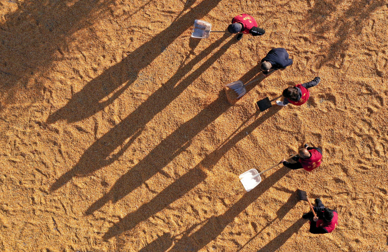 Photo aérienne d'agriculteurs séchant du maïs à Tacheng, dans la région autonome ouïgoure du Xinjiang, dans le nord-ouest de la Chine, le 5 octobre 2022