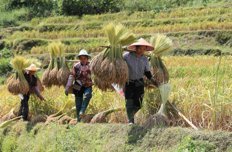 Des agriculteurs transportent du riz récolté dans le bourg de Congjiang, dans la préfecture Miao et Dong de Qiandongnan, dans la province chinoise du Guizhou (sud-ouest), le 4 octobre 2023