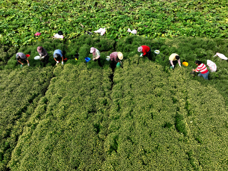Des agriculteurs ceuillent des chrysanthèmes dans le village de Donghong, à Yancheng, dans la province chinoise du Jiangsu (est), le 4 octobre 2023