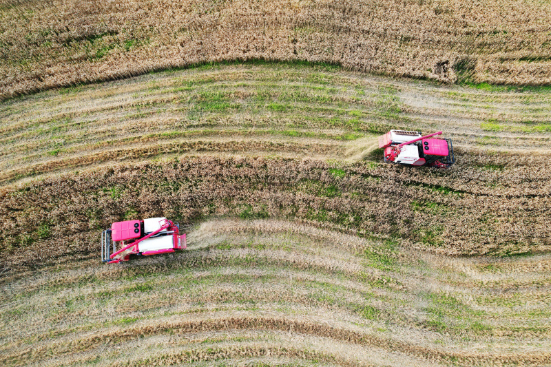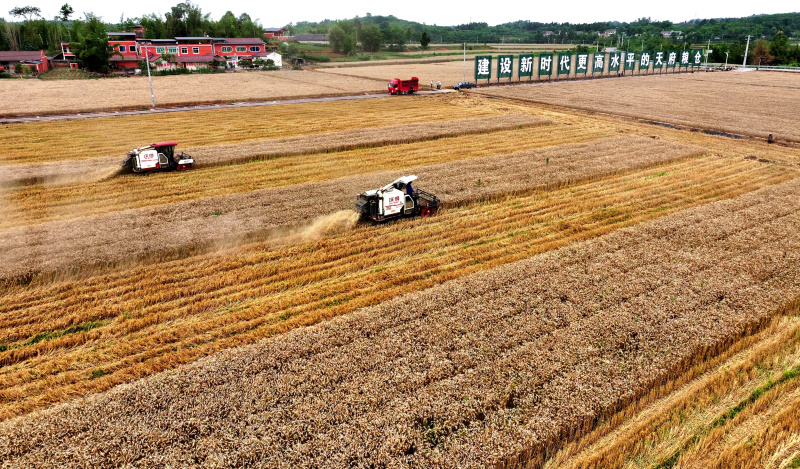Photo aérienne de moissonneuses récoltant du blé dans le bourg de Fangjia, à Meishan, ville de la province chinoise du Sichuan (sud-ouest), le 12 mai 2024