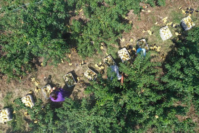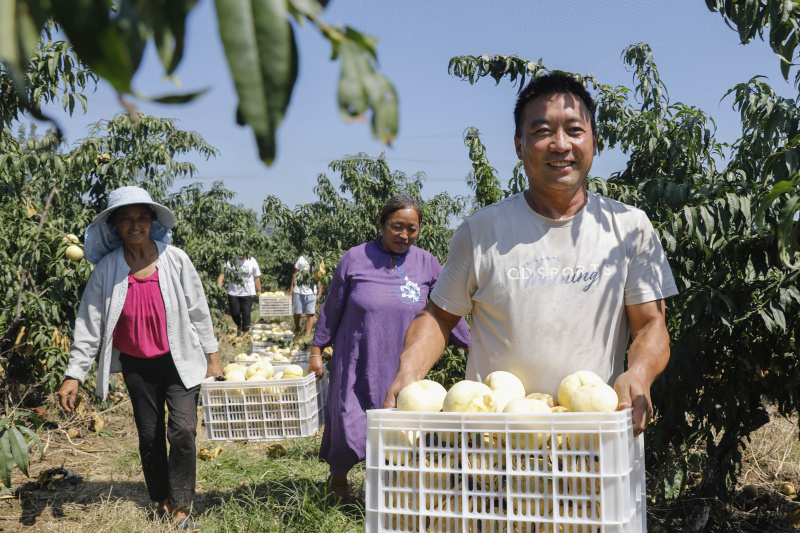 Des agriculteurs transportent des pêches fraîches dans le village de Jinli du district de Baofeng, dans la province chinoise du Henan (centre), le 8 septembre 2021. - Photo : He Wucha