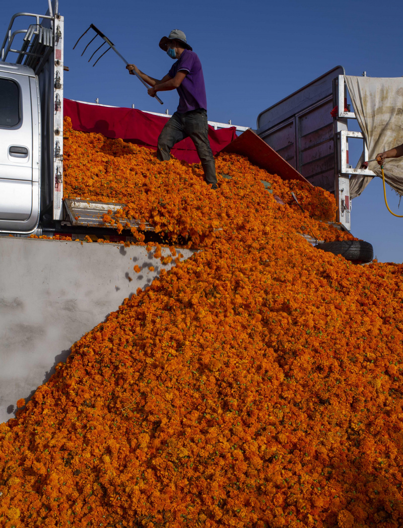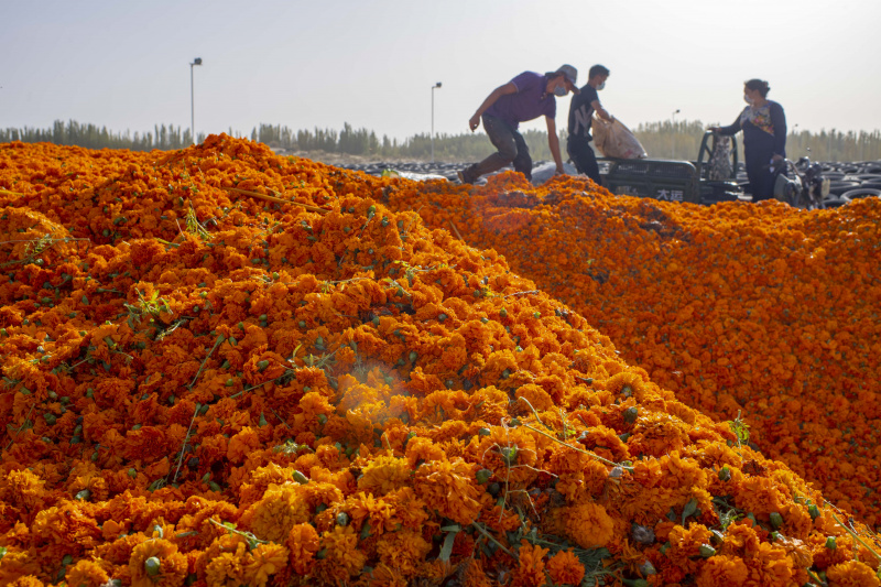 Un villageois vend des fleurs de souci dans un parc industriel agricole du district de Yutian, dans la région autonome ouïgoure du Xinjiang (nord-ouest de la Chine), le 20 septembre 2020