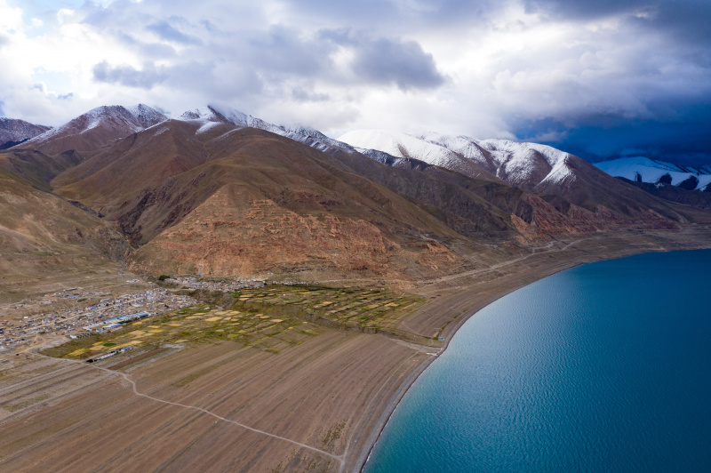 A Nyima, district de plateau, la température moyenne annuelle s'élève à -4°, et l'élevage constitue le principal mode de vie de la plupart des habitants. Une exception existe cependant, le bourg d'Ombu, où deux grands lacs, à savoir Tangra Yumco et Tangqung Co, contribuent à créer un climat rare favorable à l'agriculture dans les prairies. C'est aussi la raison pour laquelle on y trouve un si vaste champ d'orge du Tibet, paysage atypique dans le nord du Tibet. - Photo : Purbu Zha.