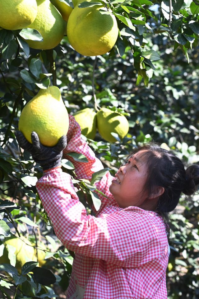 Une villageoise récolte des pamplemousses dans une zone de démonstration de l'industrie écologique dans le district autonome Mulao de Luocheng, dans la région autonome Zhuang du Guangxi (sud), le 21 novembre 2023