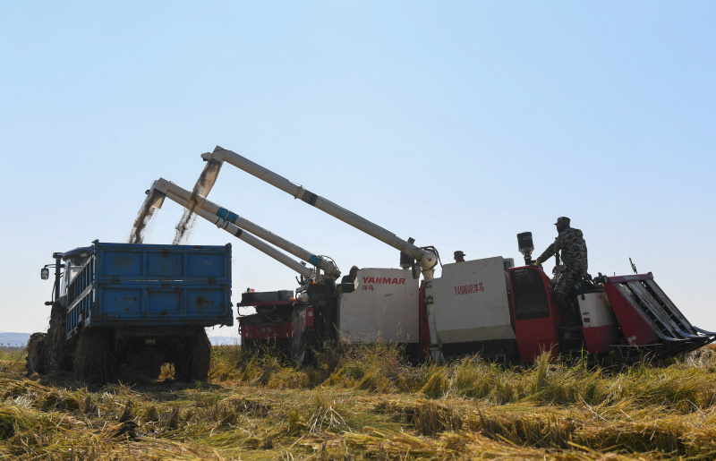 Des agriculteurs récoltent du riz dans le bourg de Xihe de la ville de Shulan, dans la province chinoise du Jilin (nord-est), le 7 octobre 2020