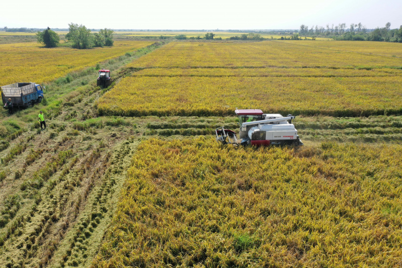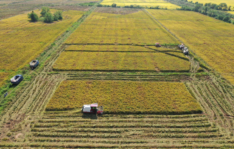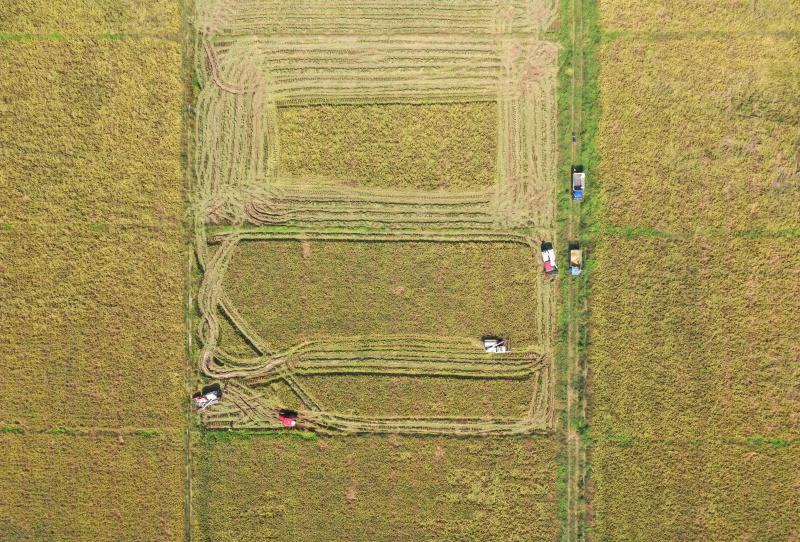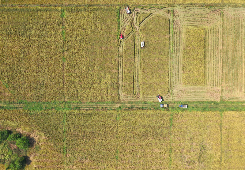 Photo aérienne prise le 4 octobre 2021 montrant des agriculteurs chargeant du riz nouvellement récolté dans le bourg de Jiangxiang à Nanchang, dans la province chinoise du Jiangxi (est). - Photo : Peng Zhaoz