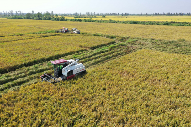 Photo aérienne prise le 4 octobre 2021 montrant des agriculteurs récoltant du riz dans dans le bourg de Jiangxiang à Nanchang, dans la province chinoise du Jiangxi (est)