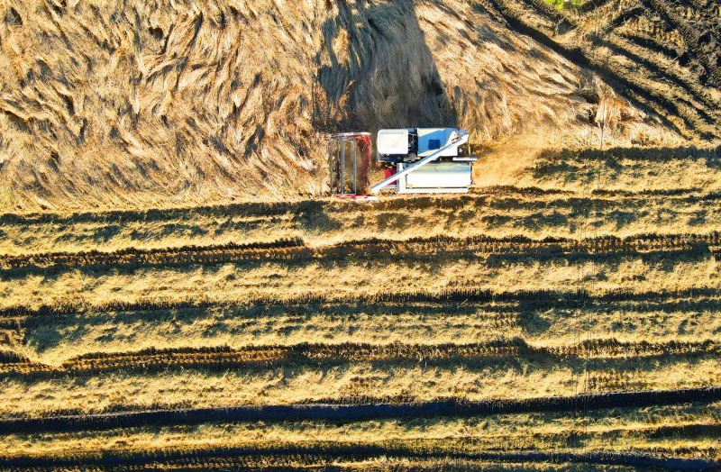 Photo aérienne d'agriculteurs récoltant du riz, dans le Nouvel Arrondissement de Shenbei, à Shenyang, dans la province chinoise du Liaoning (nord-est), le 18 octobre 2022. - Photo : Yang Qi