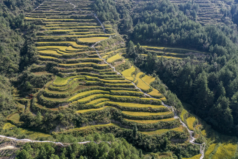 Photo aérienne prise le 3 octobre 2021 montrant des champs en terrasse dans le district autonome Tujia et Miao de Youyang, dans la municipalité chinoise de Chongqing (sud-ouest)