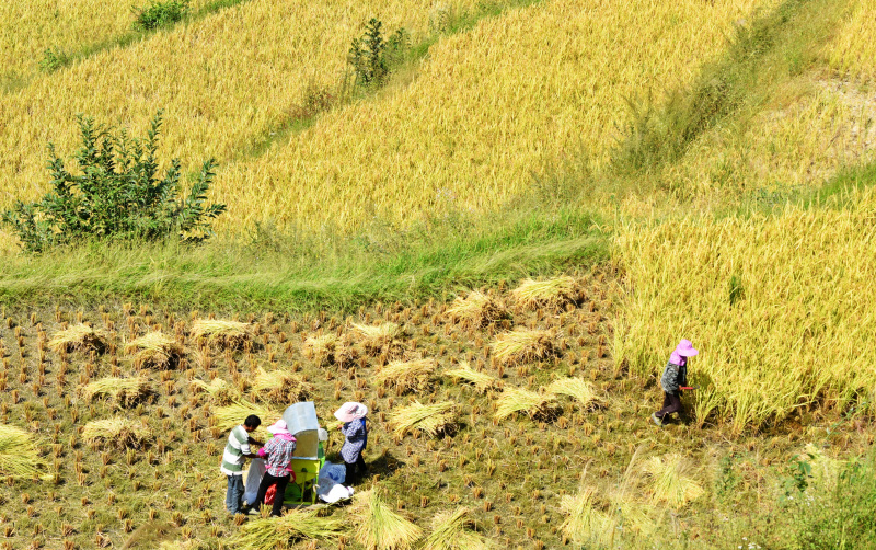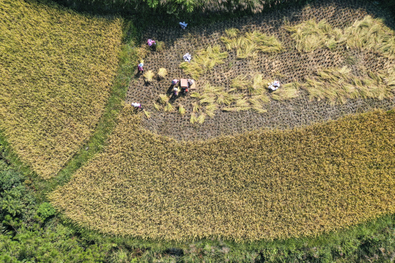 Photo aérienne prise le 3 octobre 2021 montrant des villageois récoltant du riz paddy dans le district autonome Tujia et Miao de Youyang, dans la municipalité chinoise de Chongqing (sud-ouest)