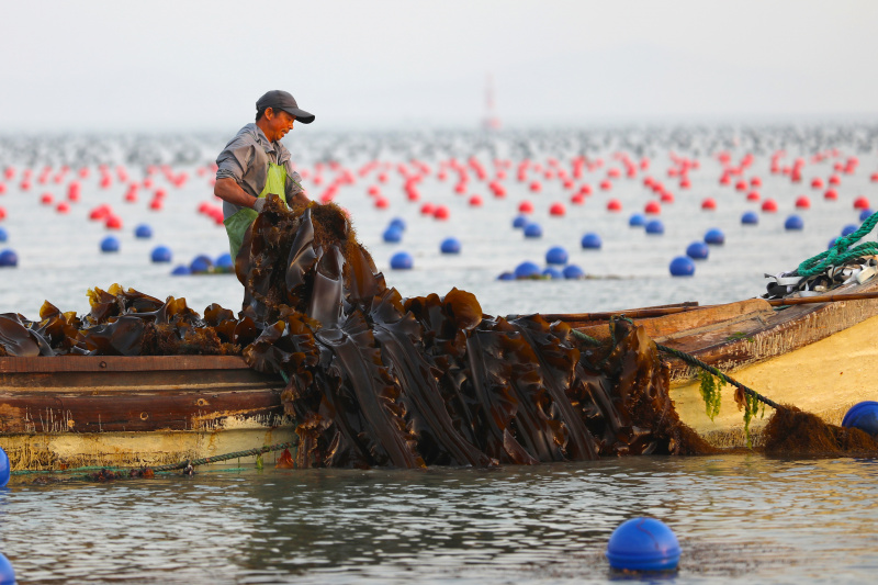 La photo montre la récolte de varech à Rongcheng, dans la province chinoise du Shandong (est), le 4 juin 2020