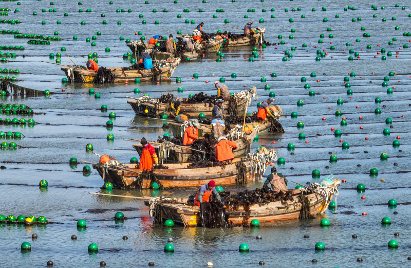Photo aérienne des pêcheurs récoltant du varech à Rongcheng, dans la province chinoise du Shandong (est), le 8 mai 2023. - Photo : Li Xinj