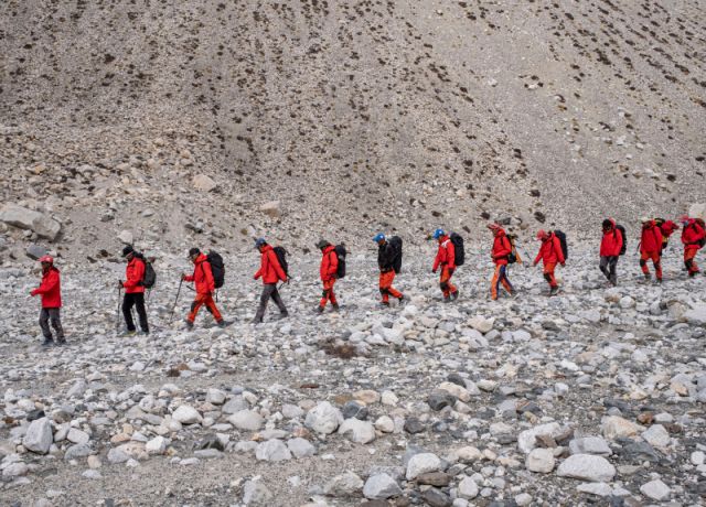 Les membres d'une équipe d'expédition scientifique chinoise sont sur le chemin du retour au camp de base du mont Qomolangma, le 5 mai 2022