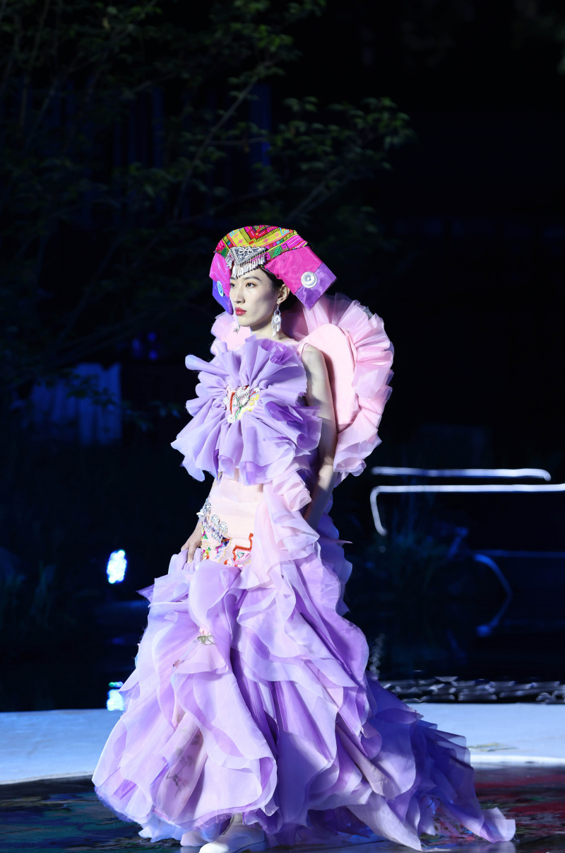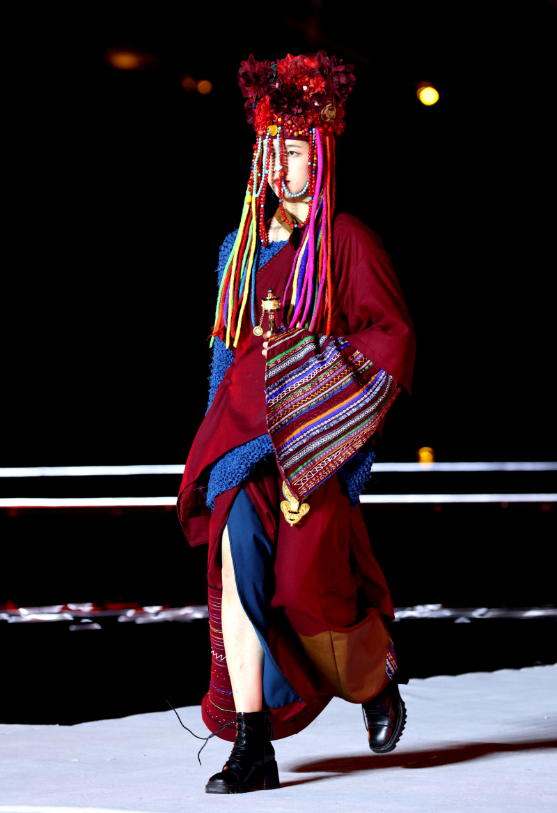 Un mannequin présente une création lors d'un salon du design sur le style indigène dans le village ethnique d'Eshan du district de Tonglu, dans la province chinoise du Zhejiang (est), le 28 avril 2021. - Photo : Chen Jian