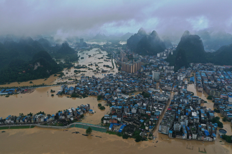 Photo aérienne du district inondé de Rongshui, dans la région autonome Zhuang du Guangxi (sud-ouest de la Chine), le 11 juillet 2020
