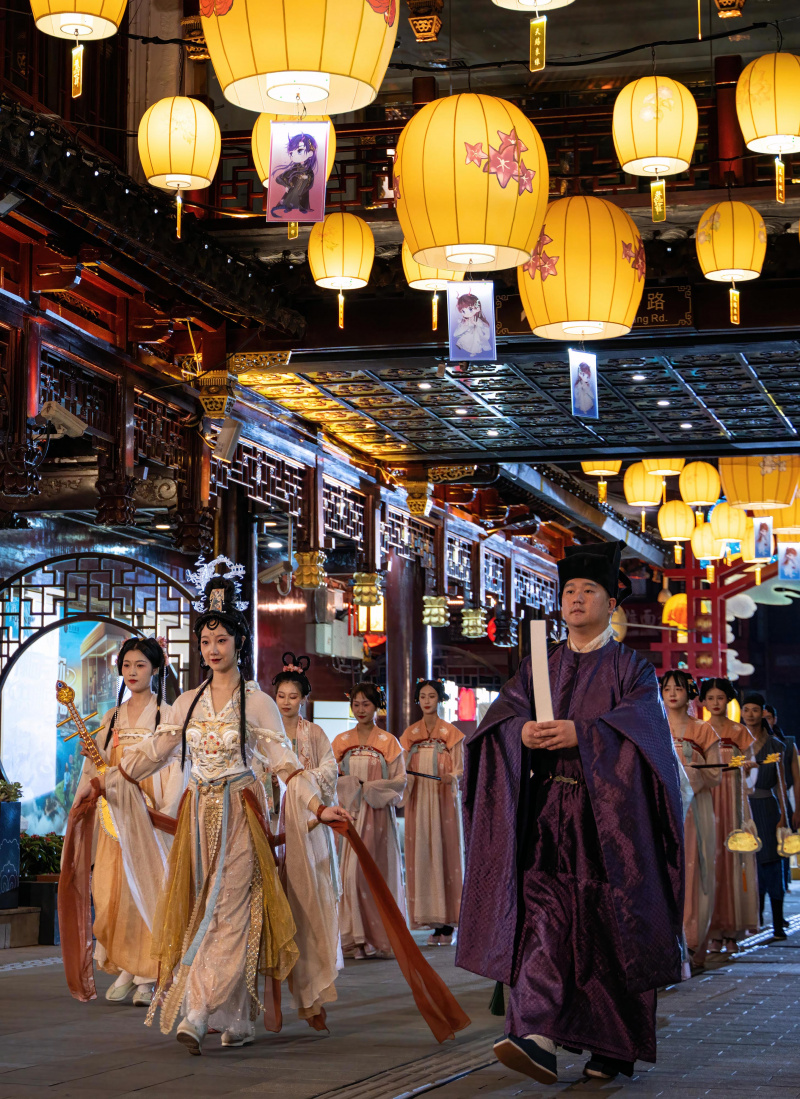 Des acteurs en costumes participent à un spectacle traditionnel au centre commercial Yuyuan Garden, à Shanghai, dans l'est de la Chine, le 23 septembre 2022