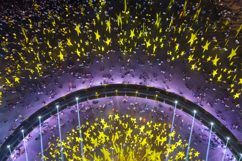Photo prise par drone d'un spectacle de lumière organisé sur une place à Harbin, capitale de la province chinoise du Heilongjiang (nord-est), le 3 mai 2024