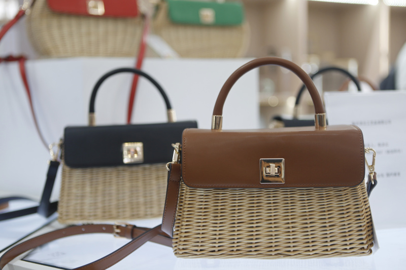 Des sacs faits à la main présentés lors de la première Exposition internationale des produits de consommation de Chine, à Haikou, capitale de la province chinoise de Hainan (sud), le 8 mai 2021