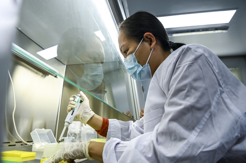 Une technicienne teste des échantillons de cultures dans un laboratoire du district de Xingye, dans la région autonome Zhuang du Guangxi (sud de la Chine), le 10 novembre 2022