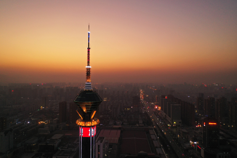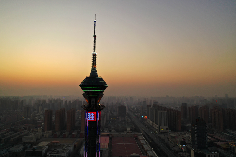 Vue aérienne de la tour de la télévision de Shijiazhuang illuminée en l'honneur de la lutte de la ville contre le COVID-19 à Shijiazhuang, dans la province chinoise du Hebei (nord), le 18 janvier 2021. - Photo : Xing Guang