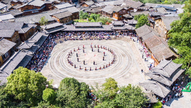 Des touristes regardent un spectacle de danse traditionnelle dans le village Miao de Xijiang Qianhu, dans le district de Leishan de la province chinoise du Guizhou (sud-ouest), le 31 juillet 2020