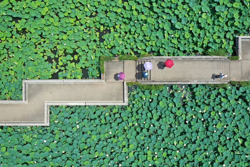Photo aérienne des touristes qui visitent un étang de lotus dans le parc de Xihu dans l'arrondissement de Shigu, à Hengyang, dans la province chinoise du Hunan (centre), le 27 juin 2020