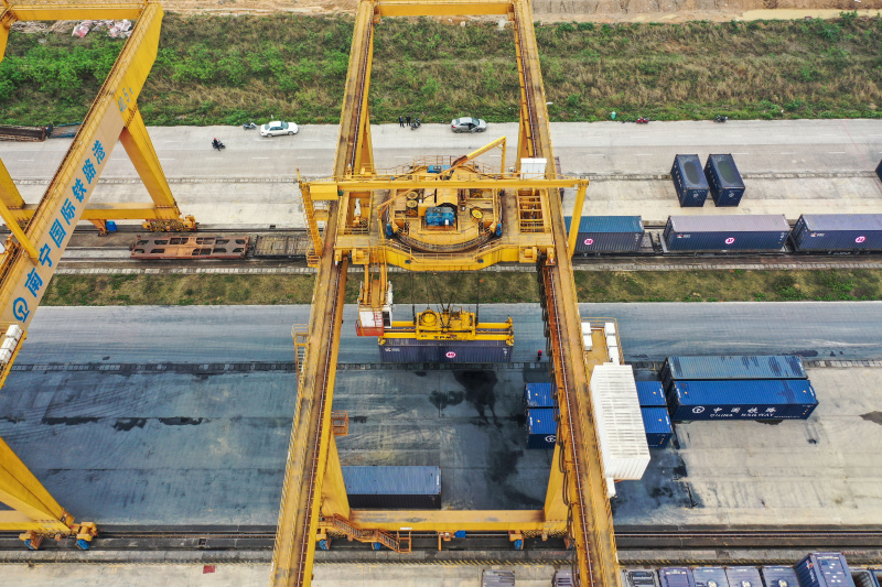 Une grue à portique charge des conteneurs sur un train de fret à destination du Kazakhstan dans le port ferroviaire international de Nanning, dans la région autonome Zhuang du Guangxi (sud de la Chine), le 12 mars 2021