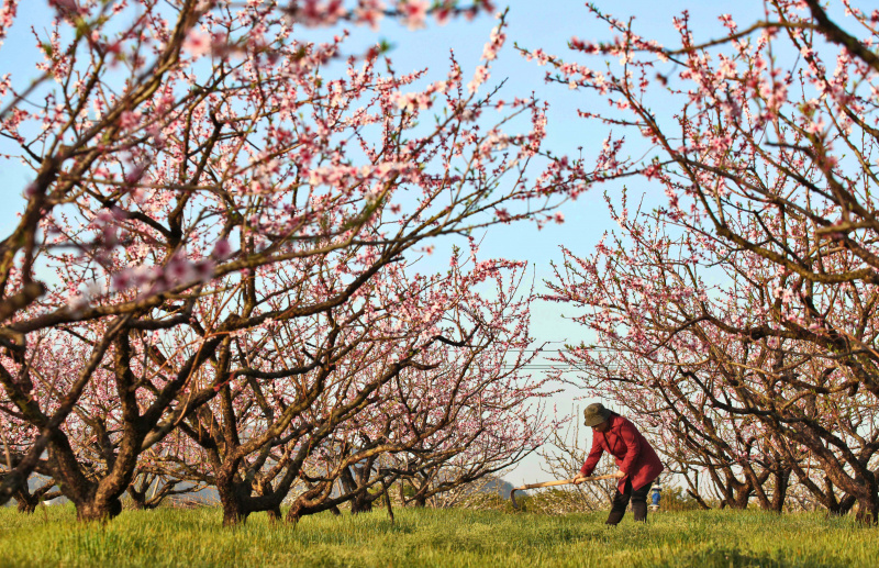 Un villageois travaille dans un verger de pêchers à Ji'an, dans la province chinoise du Jiangxi (est), le 21 mars 2023