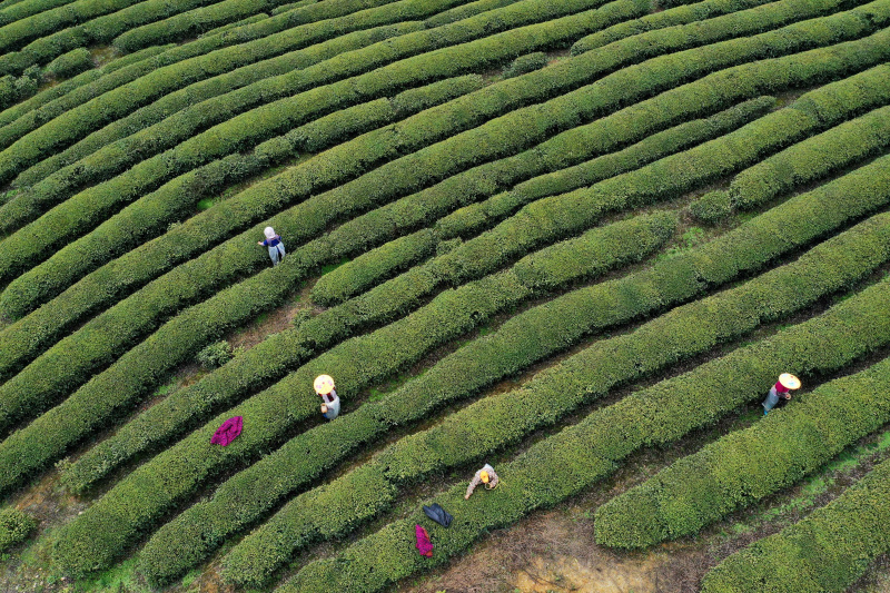 Des villageois cueillent des feuilles de thé dans la préfecture autonome Buyei et Miao de Qiannan, dans la province chinoise du Guizhou (sud-ouest), le 21 mars 2023