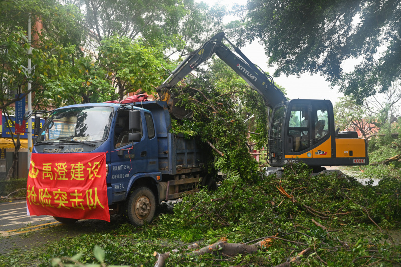 Les membres d'une équipe civile de secours déblaient des branches tombées sur la route principale à Quanzhou, dans la province chinoise du Fujian (sud-est), le 29 juillet 2023