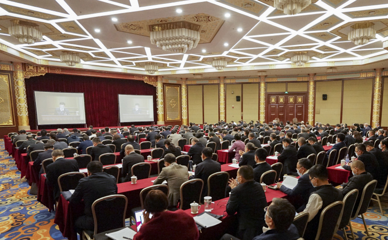 Le lieu principal d'une vidéoconférence de la première session du 14e Comité national de la Conférence consultative politique du peuple chinois (CCPPC) au cours de laquelle des conseillers politiques prononcent des discours, à Beijing, capitale chinoise, le 9 mars 2023