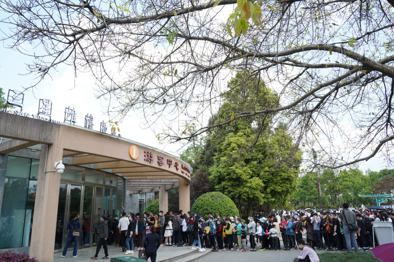 Les visiteurs attendent d'être admis devant le centre de services touristiques du musée de Sanxingdui à Guanghan, ville de la province du Sichuan (sud-ouest), le 3 avril 2021