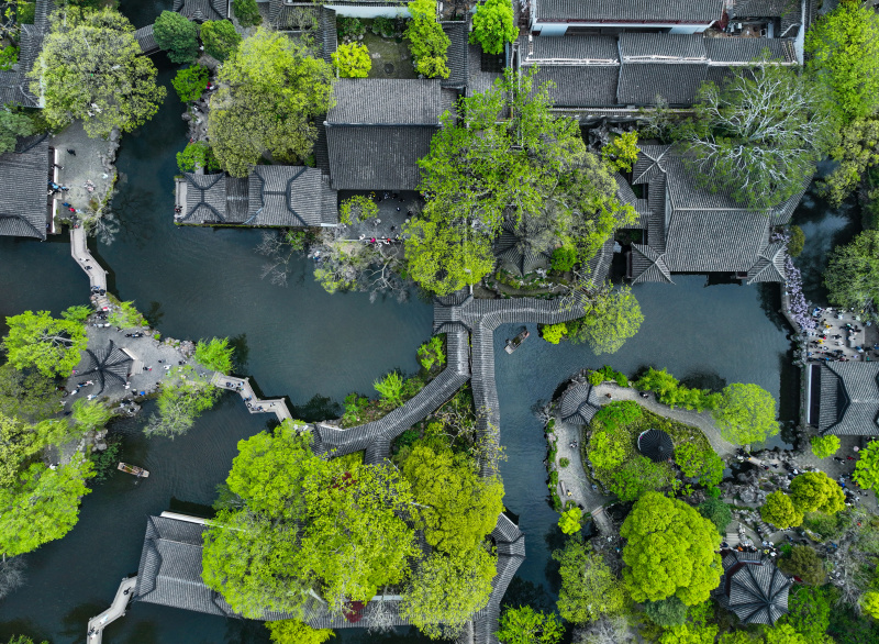 Photo aérienne d'une vue du Jardin de la Politique des Simples, à Suzhou, dans la province chinoise du Jiangsu (est), le 5 avril 2023